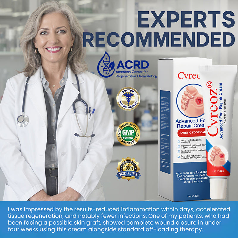 "As a diabetic wound care specialist with over 25 years of experience, I’m encouraged by plant-based formulations like Cvreoz® Advanced Foot Repair Cream, which combines clinically supported ingredients such as centella asiatica, propolis, calendula, panthenol, and turmeric extract. This thoughtful blend offers a safe, non-invasive approach to accelerate healing, reduce inflammation, and support natural skin regeneration for diabetic foot wounds.